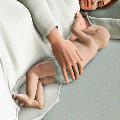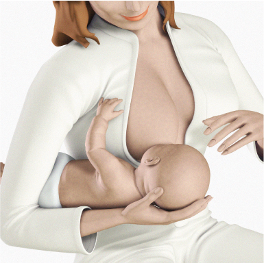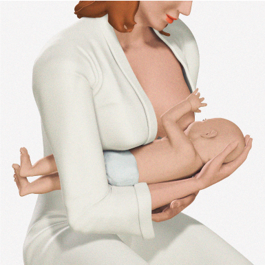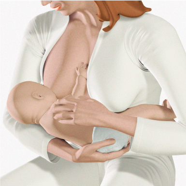 Siéntate con la espalda recta y las rodillas un poco más altas que la cintura. Utiliza un cojín en la espalda y taburete bajo los pies. Apoya al bebé en tu antebrazo, el mismo debe estar girado hacia ti y el ombligo del pequeño a la altura del tuyo. Recomendamos poner un almohadón debajo del niño.